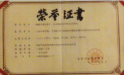 奖项项目:微量元素在中药栽培中的应用研究奖项名称及等级:1995年获国家中医药管理局中医药科学技术进步三等奖 (部级)序号:20发证时间:1996.5等级:部级获奖人员:王兴文、马治安、罗天浩、李学兰、周济桂奖项项目:微量元素在中药栽培中的应用研究奖项名称及等级:1995年获国家中医药管理局中医药科学技术进步三等奖 (部级)序号:21发证时间:1996.5等级:部级:95国中医药k-3-12获奖人