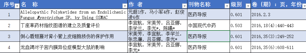 序号名 称作 者刊物名称级别卷(期):页,年份1Allelopathic Polyketides from an Endolichenic Fungus Myxotrichum SP. by Using OSMAC Strategy元超1作,马小军4作,赵俊凌6作医药导报0.6012016.2.32丁座草药材指纹图谱的建立及质量评价李宜航,宋美芳,吕亚娜,李学兰,李光*,陈曦*中国现代中药0.5