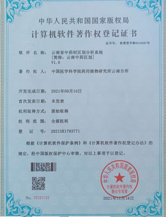 名称:云南省中药材区划分析系统 | 获批时间:9/10/2021 | 登记号:2021SR1793771 |
