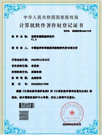 名称:南药资源数据库软件 | 获批时间:2/2/2024 | 登记号:2024SR0217899 |