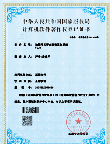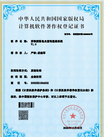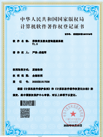 名称:苏铁常见害虫查询鉴别系统V1.0 | 获批时间:9/30/2025 | 登记号:2025SR1917538 |