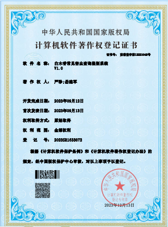名称:白木香常见害虫查询鉴别系统V1.0 | 获批时间:12/13/2023 | 登记号:2023SR1633872 |