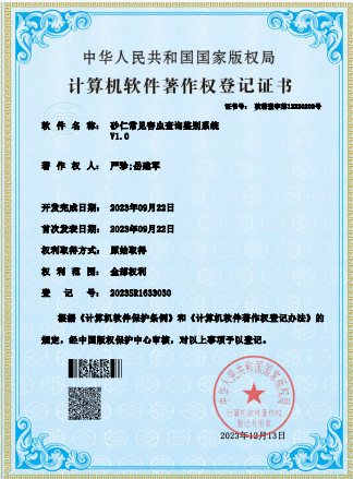 名称:砂仁常见害虫查询鉴别系统V1.0 | 获批时间:12/13/2023 | 登记号:2023SR1633030 |
