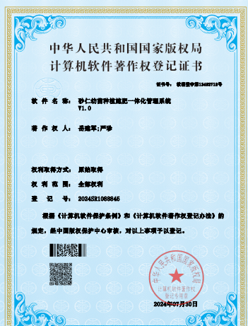 名称:砂仁幼苗种植施肥一体化管理系统V1.0 | 获批时间:7/30/2024 | 登记号:2024SR1088845 |