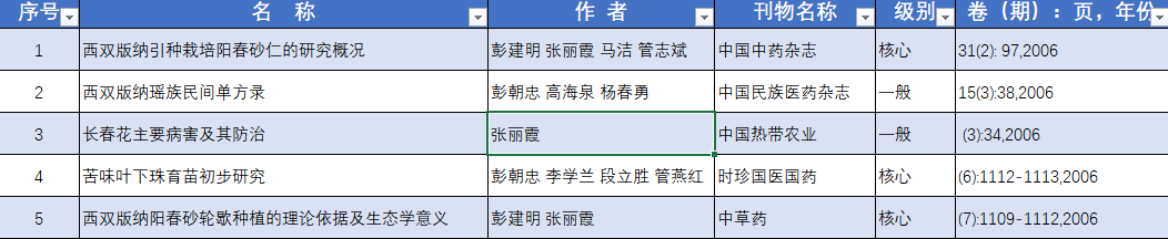 1 西双版纳引种栽培阳春砂仁的研究概况 彭建明 张丽霞 马洁 管志斌 中国中药杂志 核心 31(2): 97,2006 2 西双版纳瑶族民间单方录 彭朝忠 高海泉 杨春勇 中国民族医药杂志 一般 15(3):38,2006 3 长春花主要病害及其防治 张丽霞 中国热带农业 一般 (3):34,2006