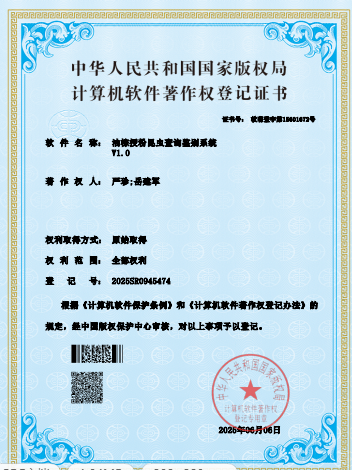名称:苏铁常见害虫查询鉴别系统V1.0 | 获批时间:9/30/2025 | 登记号:2025SR1917538 |