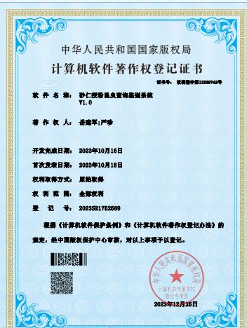 名称:砂仁常见害虫查询鉴别系统V1.0 | 获批时间:12/13/2023 | 登记号:2023SR1633030 |