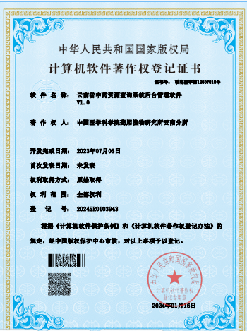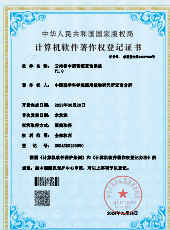 名称:云南省中药资源查询系统1.0 | 获批时间:1/16/2024 | 登记号:2024SR0103990 |