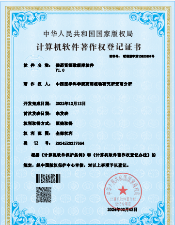 名称:南药资源数据库软件 | 获批时间:2/2/2024 | 登记号:2024SR0217899 |